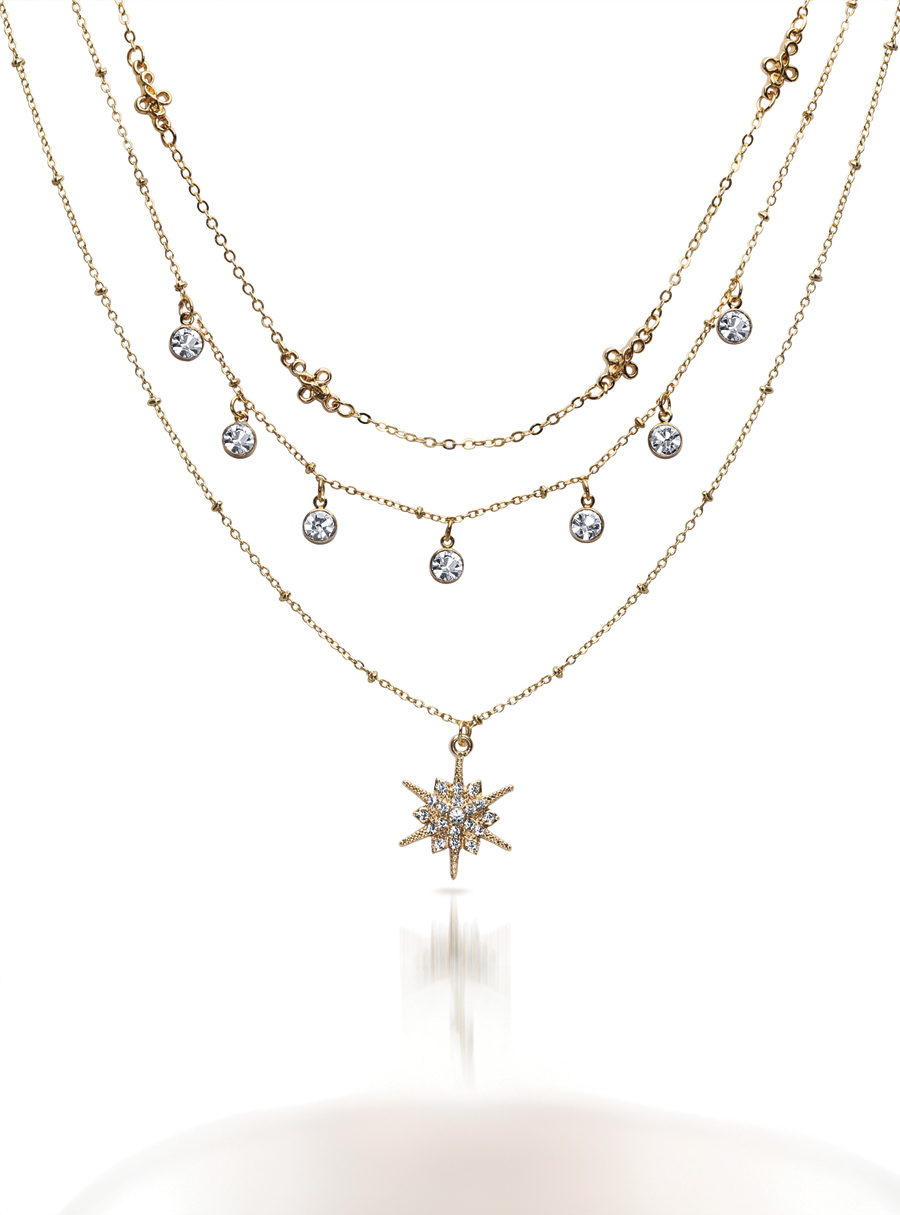 Gold tone necklace with clear crystals. Lengths – 34.3 cm / 38.1 cm / 44.5 cm.