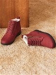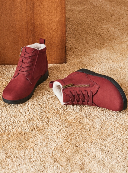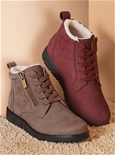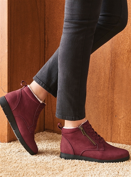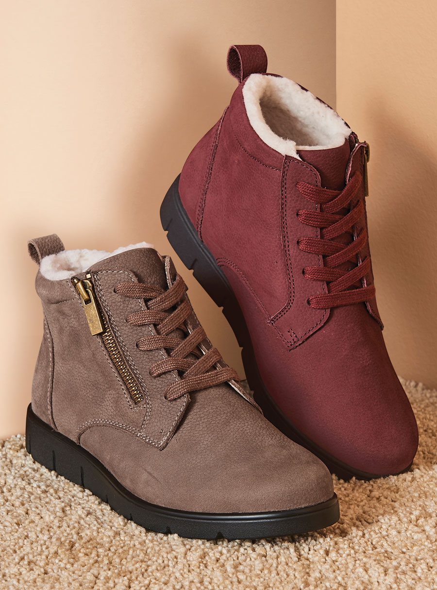Sherpa-lined suede zip boots with a removable antibacterial-treated insole, designed to keep your feet warm and comfortable. Ankle boots that are easy to slip-on, easy to wear and soft to the touch, they combine cosy insulation with everyday practicality. Genuine Leather Upper. Non-slip polyurethane sole. 2.5cm wedge heel.