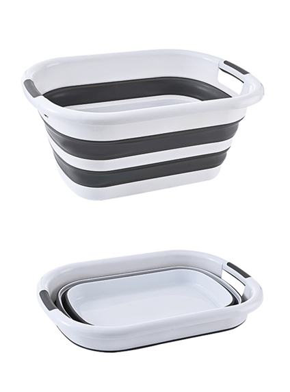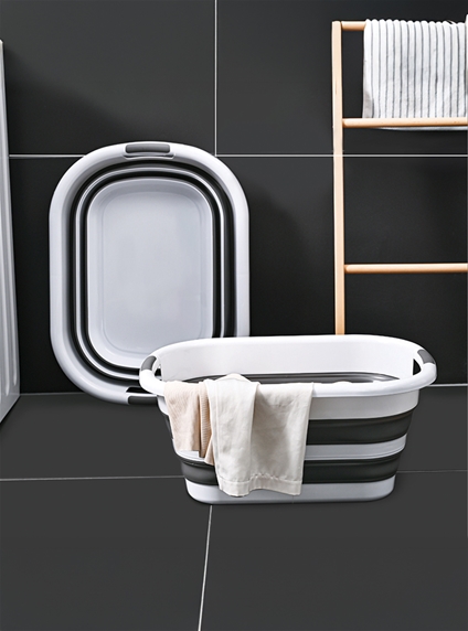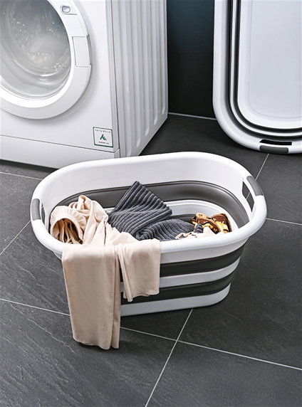 Most laundry baskets are inconvenient essentials – they take up so much space! This one solves the problem with an ingenious design that makes it incredibly easy to store. When you’re not using it, it collapses down from a roomy 24.5H x 54W x 39D cm to just 7 cm deep so you can pop it on to a shelf or slide it away in a narrow space. It’s made from easy-clean plastic and rubber in contemporary grey and white stripes. Props not included.