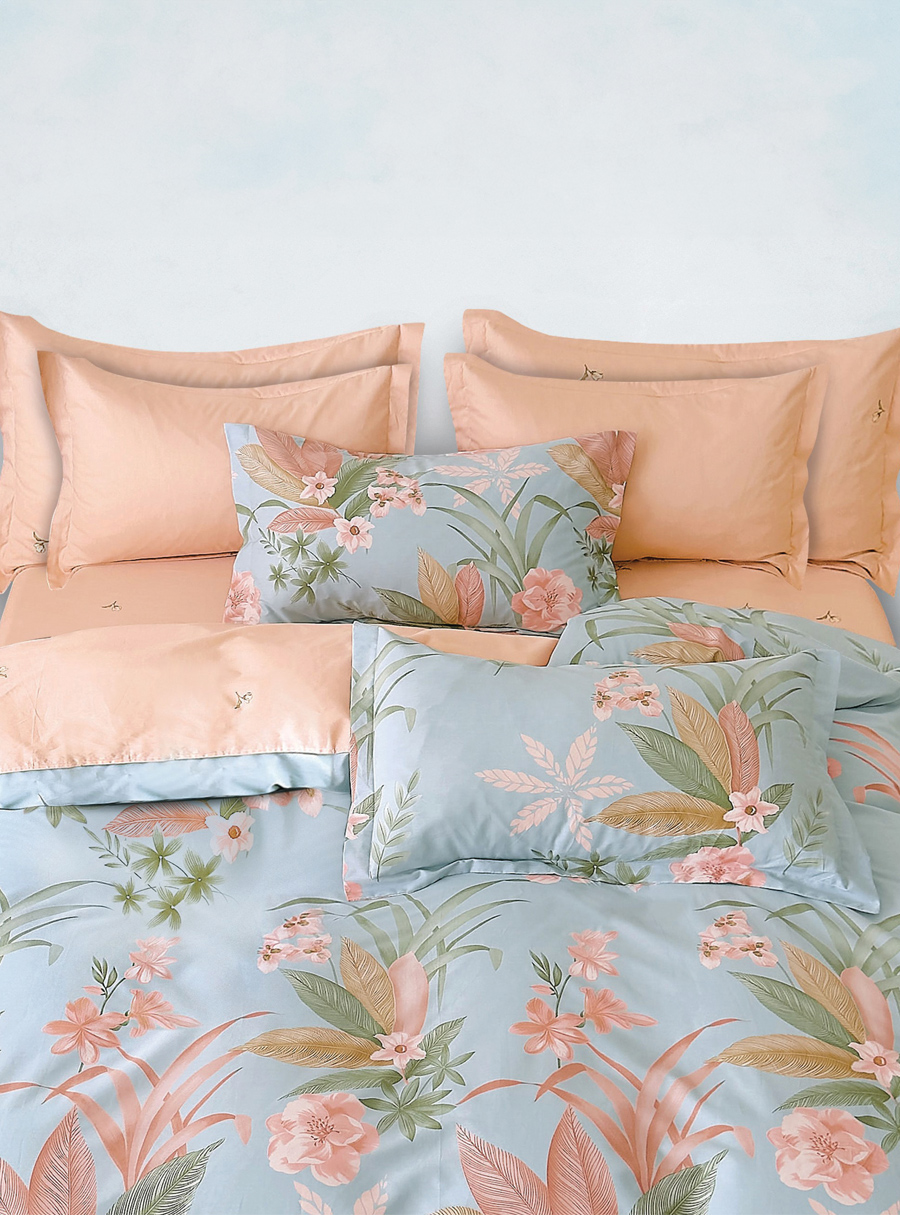 Escape to paradise with Natalya. Crafted in luxurious cotton, the Natalya Quilt Cover Set showcases stunning tropical flowers in soft pastel tones. Expertly finished with a peach floral reverse, create the perfect oasis with Natalya. 100% Cotton.