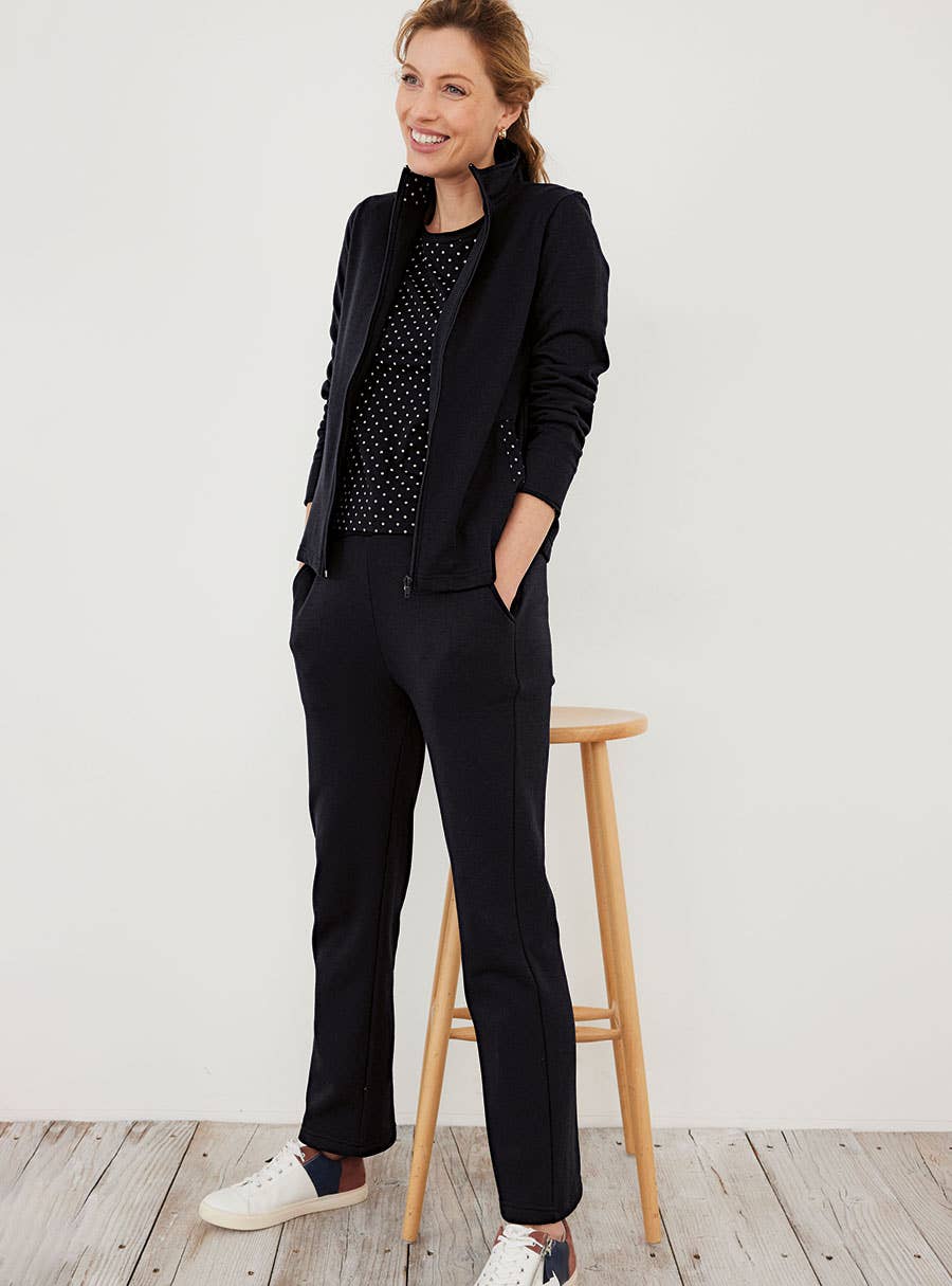 You will love this amazing 3 piece tracksuit! Featuring a jacket with zip front and front pockets with contrast polka dot trim inside the collar. Full length pants with tie front and elastic waist for a comfortable fit and 2 side pockets. Crew neck printed tee featuring a lovely polka dot design. 65% Polyester, 35% Cotton.