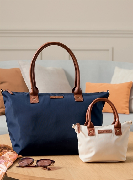 Both versatile and chic, this thoughtfully designed twin set of bags are ready to fulfill your needs. Both bags have zip closure, the smaller bag has a removeable adjustable strap. Large bag measures: 49cm x 23cm x 14cm. Small bag measures: 23cm x 14cm x 8cm. 100% Polyester, PVC Trims.