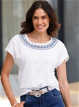 Round neck shirt with pretty, elaborate contrast embroidery on the neckline. Dropped shoulder for a relaxed fit and straight hem. 100% Cotton.