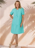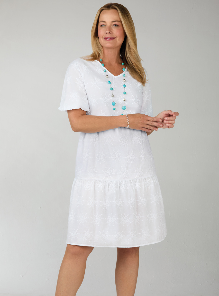Crafted from 100% cotton, this tiered dress features delicate embroidery for a feminine touch. With its breezy silhouette and soft flutter sleeves, it’s a fresh and effortless choice for warm-weather style. 100% Cotton.