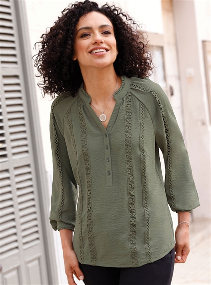 Blouse in easy-care crinkle fabric with lace at the front and on the sleeves. Decorative ruffles and gathering at the round neckline with a small V and short button placket. Button cuff and ruffle trim at the end of the long raglan sleeves. 100% Polyester.