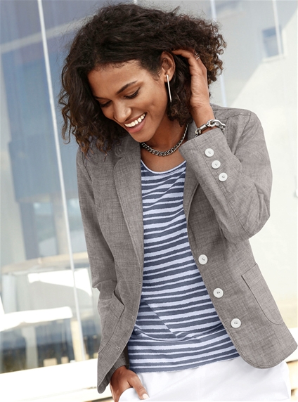 Made from cool and crisp cotton, stylish blazer with lapel, button front and 2 patch pockets. The shoulder pads create a nice silhouette. Long sleeves with button decoration. 100% Cotton.