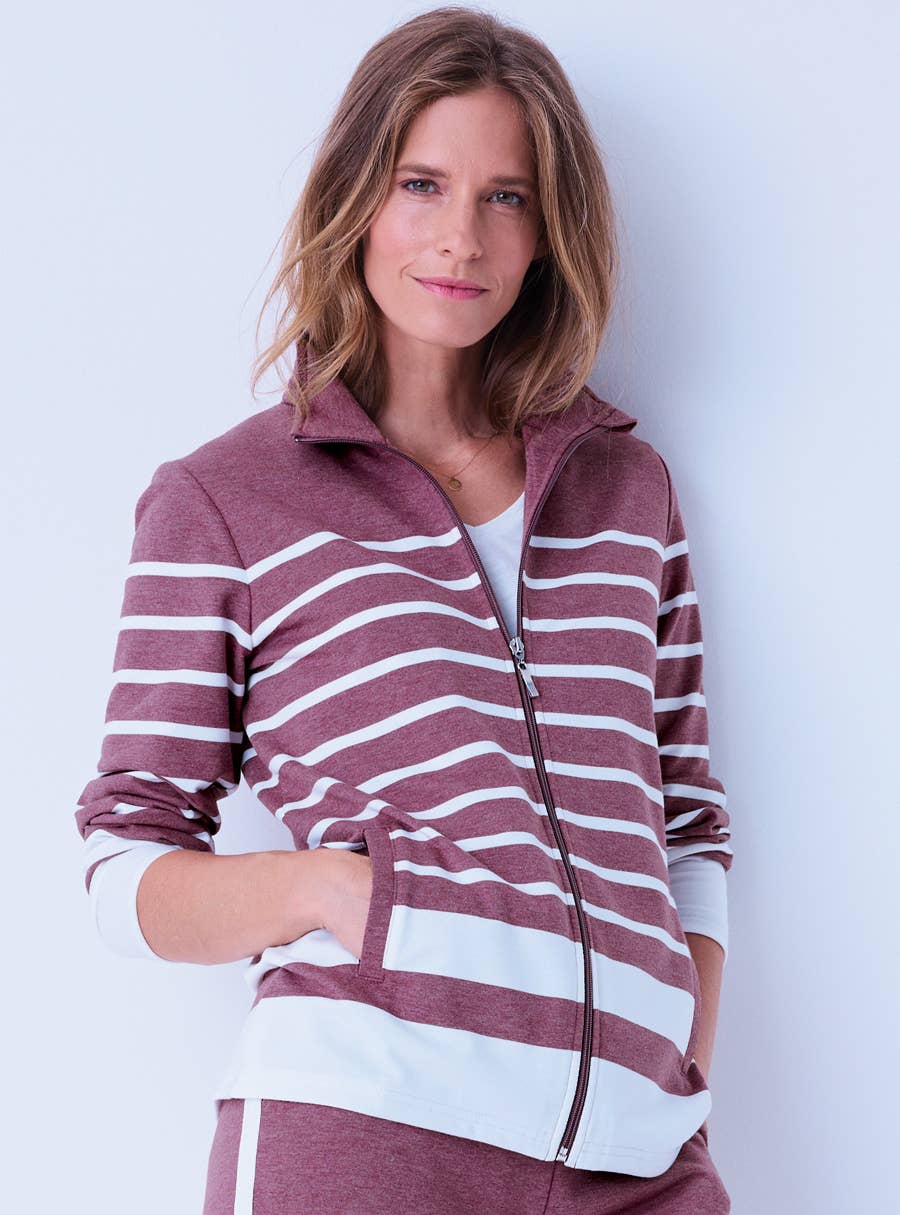 A playful and sporty style stripe jacket. Featuring high collar and full zip front. Two pockets to store any essentials and in a relaxed comfortable fit. 65% Polyester, 35% Cotton.