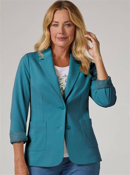 A fully lined two-button blazer in wrinkle-resistant double-knit fabric, featuring patch pockets and a back vent for comfort, fit and easy everyday wear. Main: 78% Polyester, 18% Viscose, 4% Elastane. Lining: 100% Polyester