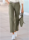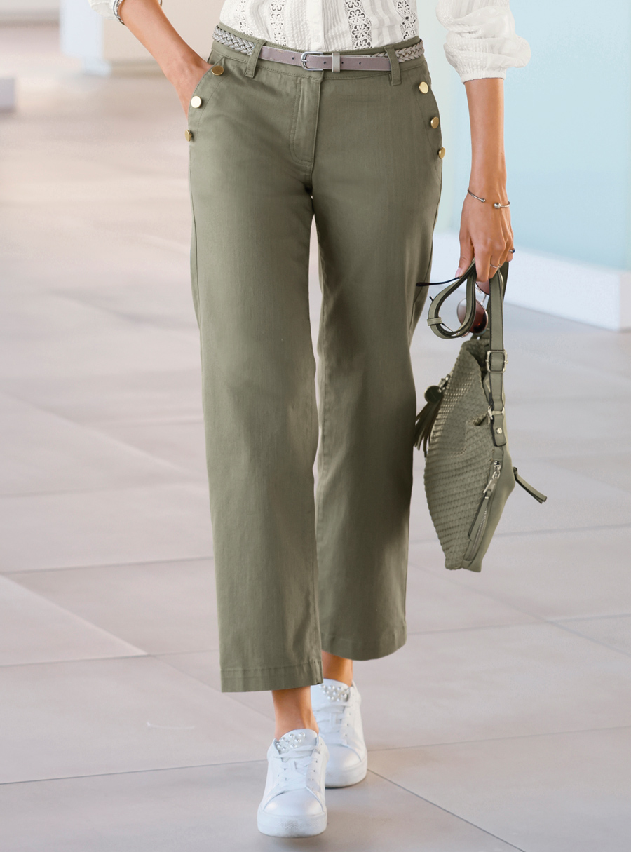 Trendy trousers with wide legs and matte gold-coloured decorative buttons on the side pockets. Waistband with a button and zipper and belt loops (Belt not included). Fitted yoke at the back and 2 pockets. Length: 94cm-98cm. 96% Cotton, 4% Elastane.