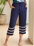 A stylish addition to your summer wardrobe! These culottes have an elastic waist with a front drawstring decorated with beads and tassels. Lace inserts above the hem and two front pockets. 100% Viscose.