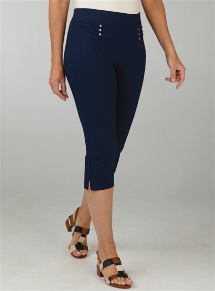 These pull-on pants will complete any outfit this season. Made in a soft comfortable viscose blend with stretch to move with you. Featuring decorative rivets alongside pintucks and a front panel to elongate the legs. 76% Viscose, 21% Nylon, 3% Elastane.