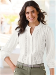 This lace blouse has lots of charming details: impressive seersucker with lace edging, ruffles on the round V-neckline with button placket and elasticated long sleeves. Slightly rounded hem and back yoke with box pleat for a comfortable fit. 100% Cotton.