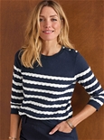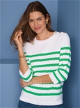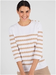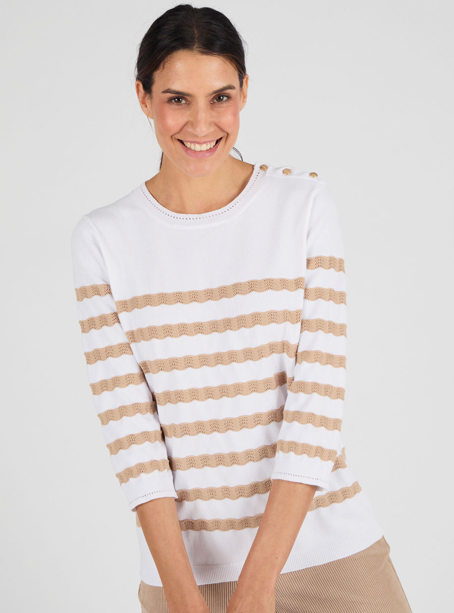 Chic striped sweater in organic cotton with gold-buttoned shoulders and 3/4 openwork sleeves. 66% Cotton, 34% Polyamide.
