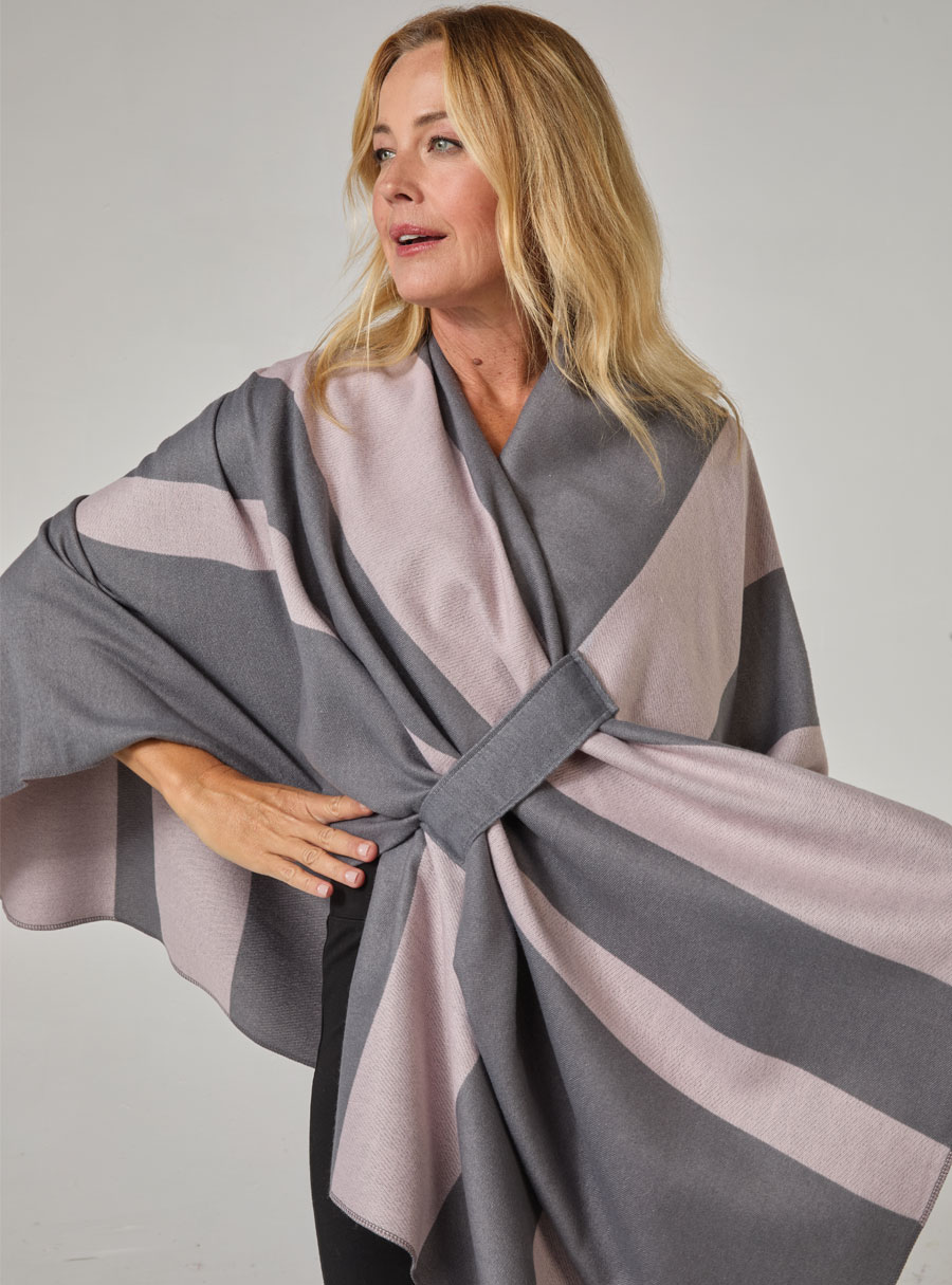 Stripe shawl with matching self loop for an elegant, secure draped finish.