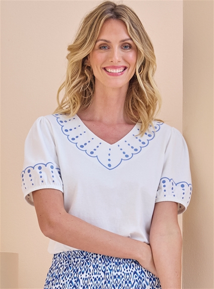 Pretty meets practical – this pure cotton tee is finished with delicate embroidery at the collar and cuffs for a touch of charm. 100% Cotton.