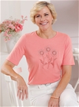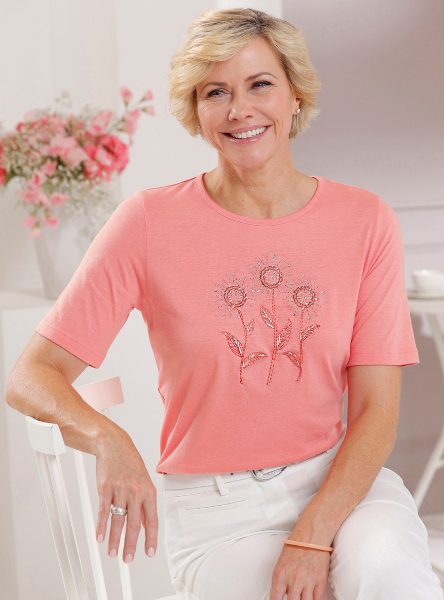 Soft shirt with distinctive floral embroidery and glitter stone embellishment on the front. Round neckline with binding. 50% Cotton, 50% Modal.