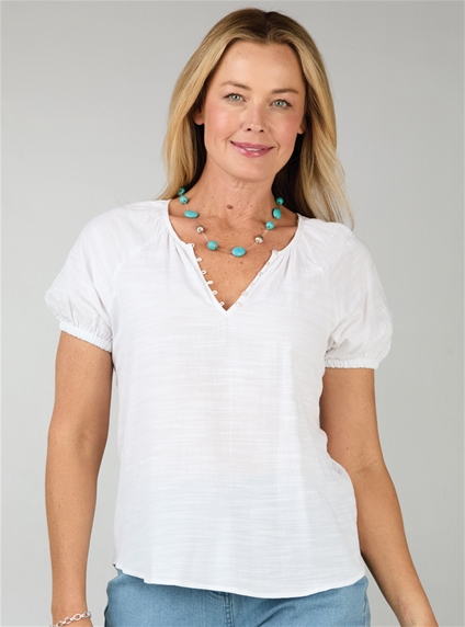 Breezy and feminine, the Cotton Slub Peasant Top is your go-to for effortless everyday style. Made from 100% breathable cotton, it features a relaxed silhouette, soft short sleeves, and a charming notched neckline. Perfect for warm days and casual outings. 100% Cotton.