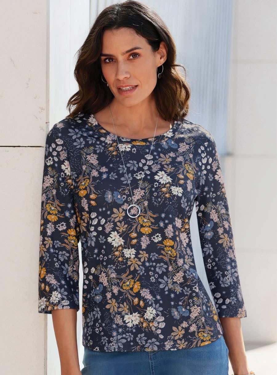 The soft quality of this brilliant print shirt with a floral design looks like the finest knit. 3/4-length sleeves. 95% Polyester, 5% Elastane.