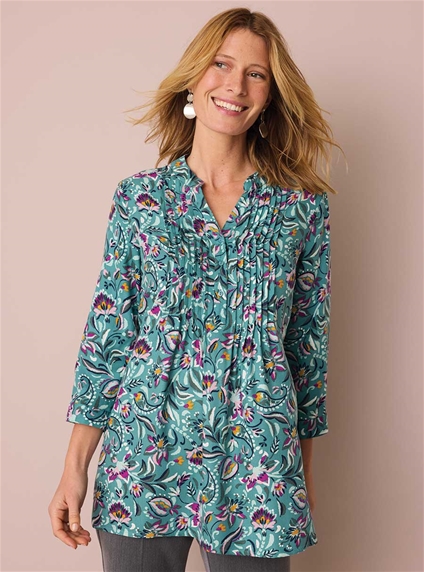 Designed for style, this tunic is adorned with an all over paisley print. An open V neckline with a short button placket and pleats. 3/4 length sleeves with button cuffs and side slits for ease of wear. 100% Viscose.